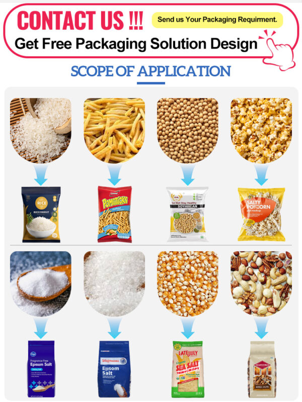 This machine is suitable for granular bag packaging, such as coffee beans, candy granules, chopped nuts, oatmeal, chocolate beans, rock candy, plastic granules, feed granules, laundry detergent, bath salt granules, etc.